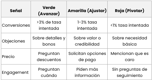 Una tasa de conversión del 2-5% sugiere interés viable. Por debajo del 1% indica que el concepto o mensaje necesita revisión.